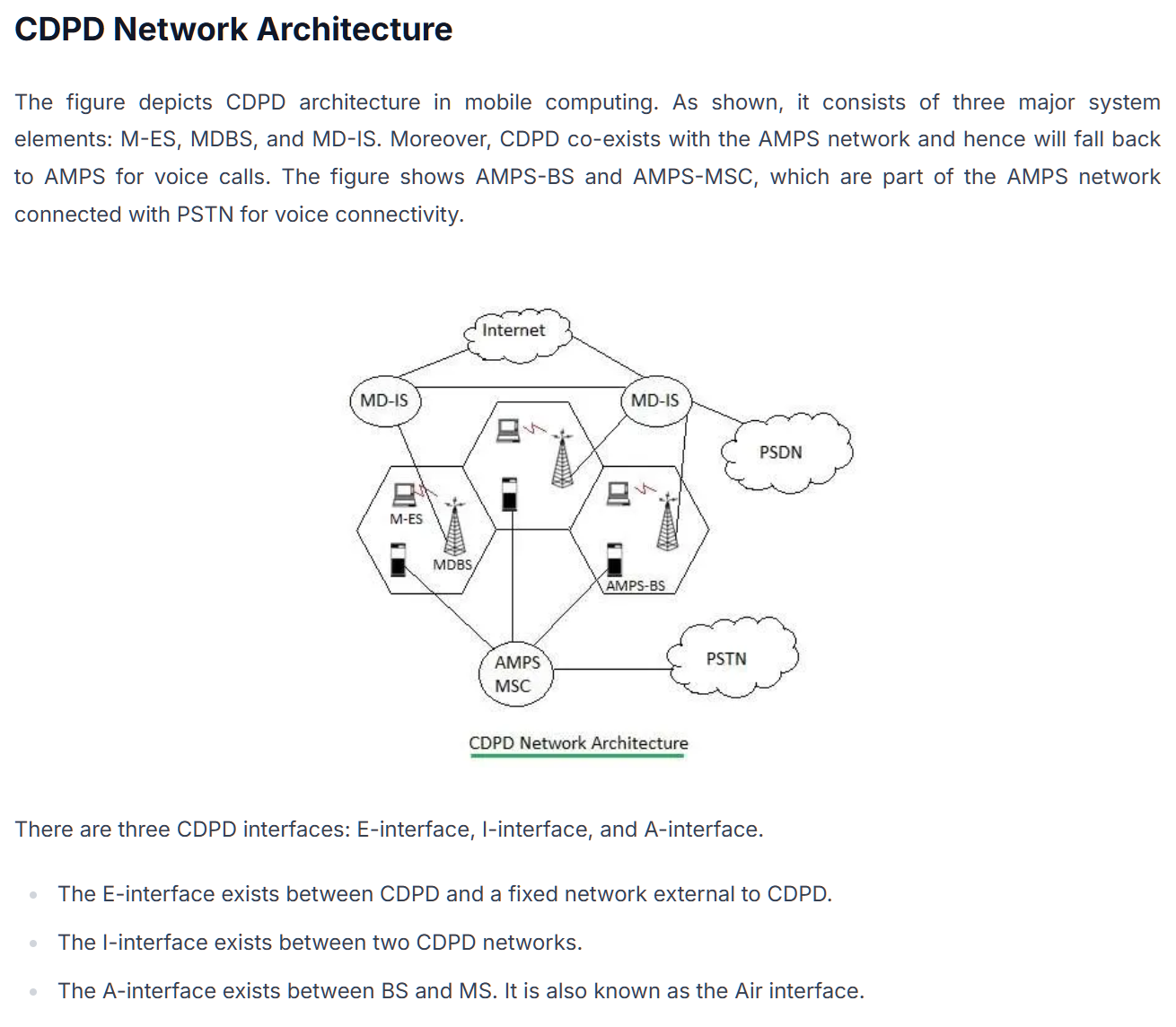 CDPD utilizes existing cellular telephone network to transmit data. It uses an idle channel in existing analog cellular systems to provide a connectionless service. When a channel is not being used for voice traffice, it can be used to send and receive packets from the CDPD-equipped mobile station. Cellular channel can be shared between voice and data service in this way, or the cellular carrier can remove some channels from voice service and dedicate them exclusively to data service. CDPD is best-suited for the shot and bursty data transmissions such as messaging, despatch, packet tracking, and remote device monitoring. https://www.andrew.cmu.edu/user/rk2x/telclass.dir/oldstudentprojects.dir/proj3.dir/cdpd.html